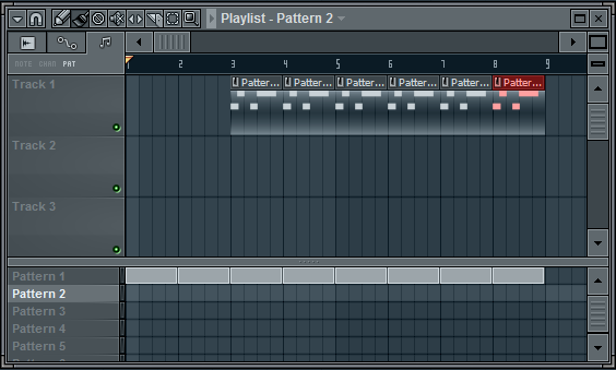 Beneath these areas you will see an area where things are split, the bottom section generally indicates the pattern sequence section, while the top indicates the clip section, giving a visual display in a group like function of any sampled sounds and beats that are used in the track, the pattern sequence section itself is easily identifiable by reviewing the left hand side of the screen where a list of patterns should be visible with small grid section squares.