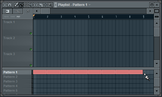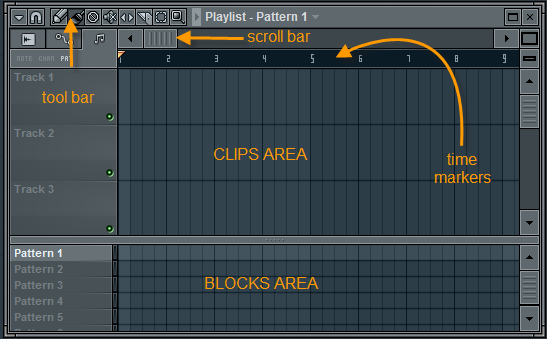 Using the playlist window, the best place to start is by arranging your different patterns into a particular sequence, simply access the playlist section and navigate all ll the way to the left hand side, from there you will see that the pattern block area is visible.