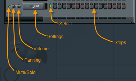 You can of course select multiple channels at a time by using the right mouse click function as well, and at last one of the most notable features is you should see the row of different buttons, these are know as the steps, and this is where you will place your beats.