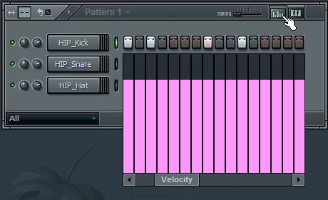 Different elements of specific steps can also have variable controls adjusted, such as its audio level or speed by selecting the visual display editing button which is positioned near the swinging slider in the top right hand section of the pattern window itself, by clicking on this it will instantly allow you to see all the different options of your current active channel and you can use the sidebar to move through all the different options that are available for you to tweak and edit, when your done simply press the visual display button to return to the original view.